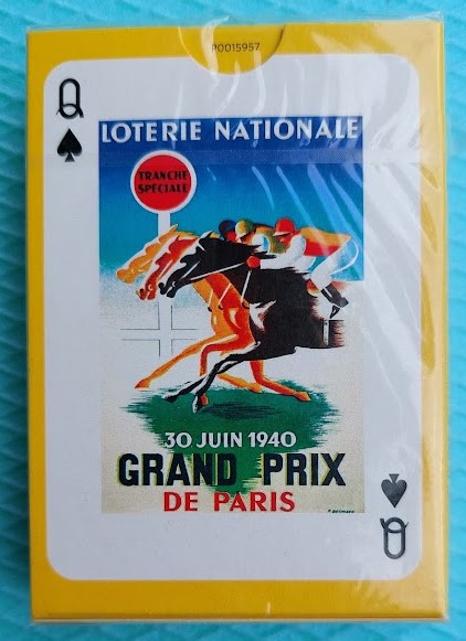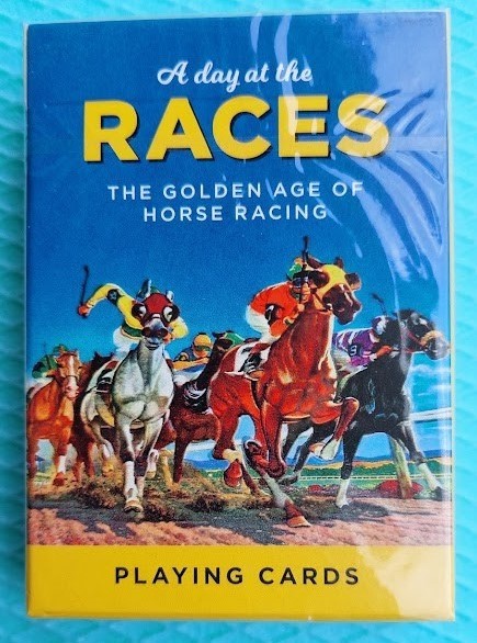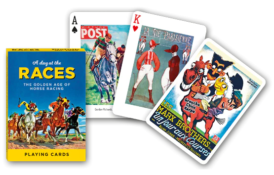 Картите за игра A Day at the Races Piatnik са идеалният подарък за любителите на конните надбягвания или за колекционерите на карти! Конните надбягвания, спортът на кралете, са вдъхновявали класическите плакати и запомнящото се графично изкуство през годините назад във времето. Картите отбелязват целия блясък, вълнение и цвят на един ден на състезанията и златната ера на конните надбягвания.