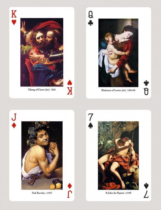 # Изкуството на Микеланджело да Караваджо е „израз на неговата бурна природа“, на тъмнината по обяд. Тези уникални карти за игра възхваляват драматичните картини на един насилствен гений. Определяща фигура в италианското изкуство от 17-ти век, неговият уникален поглед върху реализма е вдъхновил бароковия стил на живописта от по-късните години.