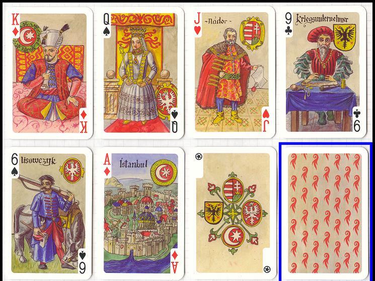 Картите изобразяват четири нации в края на 16-ти век в Унгария: Унгарци (Купи), Османци (Кари), Германци (Спатия) и Поляци (Пики)