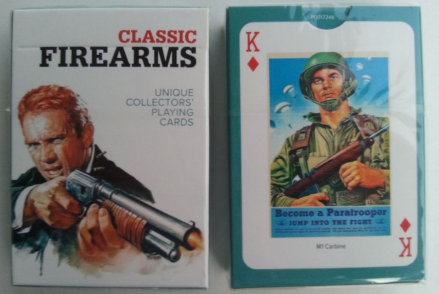 Класически карти за игра на огнестрелно оръжие, като класическото огнестрелно оръжие от битката при Waterloo присъства на всяка карта. Знакови оръжия в блестящи снимки, плакати и винтидж корици на списания. Тази оригинална презентация отпразнува изкуството на оръжейника. Тези карти за игра на Piatnik Firearm съдържат изображения на огнестрелно оръжие като: пистолет-автомат Beretta, пистолет Bren – напълно автоматична лека картечница, пистолет Colt, противотанково оръжие Panzerfaust, пистолет за бунт, испански Mauser, Smith & Револвер „Уесън“, пистолет-картечница „Стенгун“, автомат „Томпсън“, наречен също „Томигун“, картечница „Викерс“ и пушка „Уинчестър“.