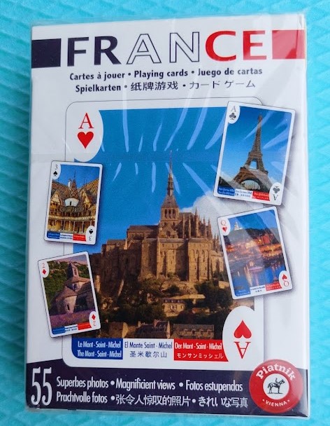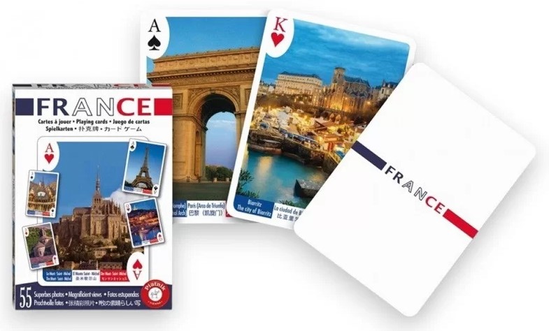 Картите за игра FRANCE • JEU DE CARTES Piatnik са идеалният подарък за за колекционерите на карти или за почитателите на Франция. На колодата карти са отпечатани: 55 различни снимки на популярни места в Франция, в това число Айфеловата кула, Мон Сен Мишел и неговия залив в Нормандия и много други забележителности!