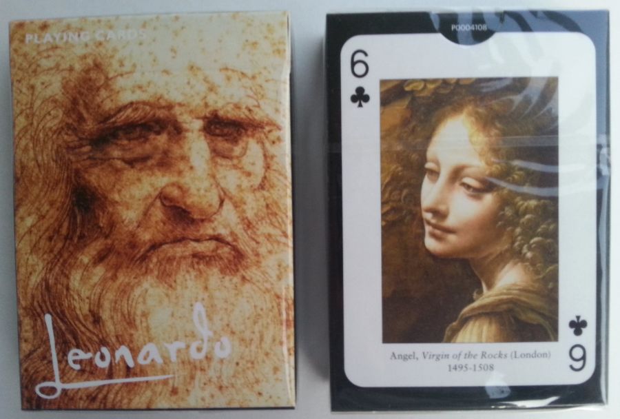 Леонардо да Винчи, олицетворение на човек от Ренесанса, който бе учен, изобретател и художник с ненадминат блясък. Картите Leonardo имат 52 уникални дизайна, като всяка карта празнува възвишеното изкуство на неспокойният гений Леонардо Да Винчи, от мистериозната красота на Мона Лиза до одухотворената интензивност на неговите мадони, светци и ангели.