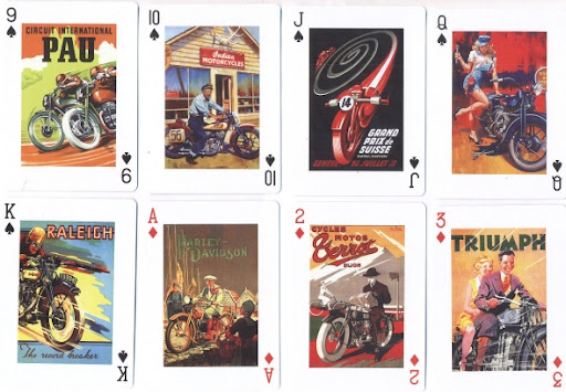На всяка една карта от тестето, включително и на тези които са с малките номинали са илюстрирани ретро мотоциклети! Любителите на мотоциклети ще се удивят на красивите марки мотоциклети като: Harley-Davidson, Индийски мотоциклети, Triumph, Vespa и Zündapp.