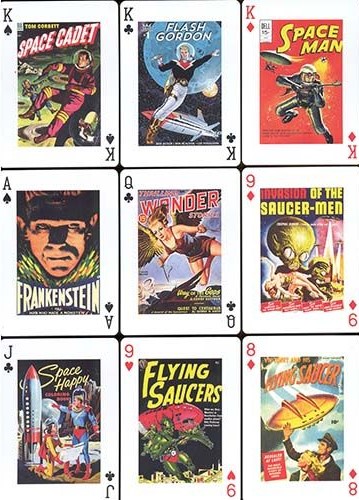 Картите за игра Science-Fiction Piatnik са идеалният подарък за любителите на класическото кино и научната фантастика или за колекционери на карти. На колодата карти са отпечатани: 54 изображения на роботи, ракети, извънземни, андроиди, марсианци и чудовища от различни плакати на научно-фантастични филми: Франкенщайн, Невидимият човек, Флаш Гордън, Космическият човек, НЛО, Човекът от планетата X, Аз, роботът и други. На гръбчето на картите са илюстровани оръжия или бластери от различни филми.