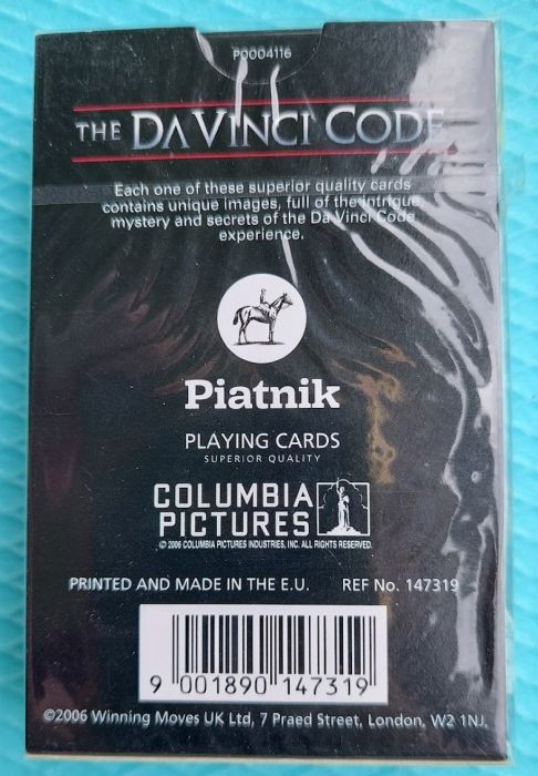 Картите за игра The Da Vinci Code Piatnik са идеалният подарък за любителите на книгата Шифъра на Да Винчи, написана от автора Дан Браун, която е пълна с интриги, мистерии и тайни. Чрез комбиниране на жанровете на детективския трилър и езотериката на Ню Ейдж, с теория на конспирацията, свързана със Светия Граал и ролята на Мария Магдалена в християнството. Романът предизвика широк интерес към определени теории за заговори, „излюпени в сенките от окултни сили“. Феномен, определен от Браун като „бум на конспирацията“.