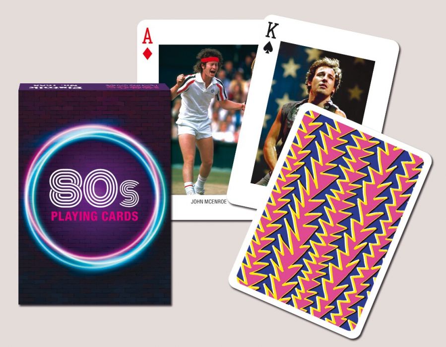 Картите за игра 80 s, The Eighties Piatnik са идеалният подарък за носталгично настроените от Вас, които си спомнят с умиление 80-те години на миналият век или за колекционери на карти. На колодата карти са отпечатани: снимки, рекламни плакати, корици в пресата или филми от 80-те години. Като започват с убийството на Джон Ленън и завършват с краха на комунизма, минавайки през клинове и ликра, лоши коси и лоши момчета. Играйте карти с ликовете на Джон Макенроу, Принс, Фреди Меркюри, Брус Спрингстийн, Майкъл Джексън, Джейн Фонда, Пабло Ескобар. Маргарет Тачър, Wham!, Duran-Duran, Bananarama, Силвестър Сталоун, Ловци на духове, Терминатор, Майк Тайсън, Уитни Хюстън,…