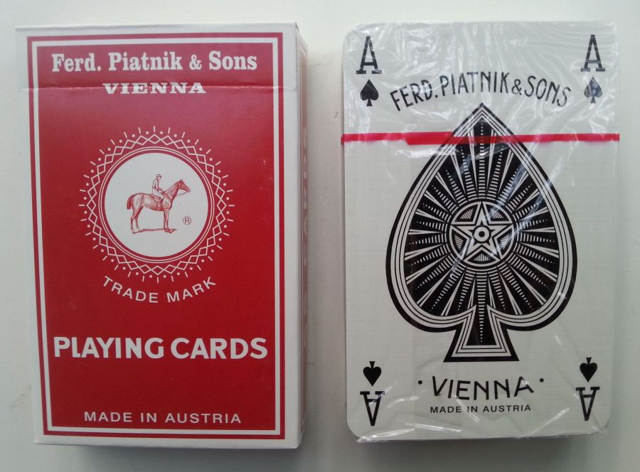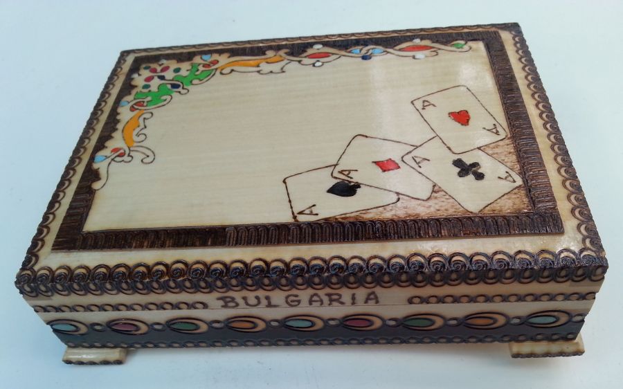 Двойна кутия за съхранение на карти за игра с пирография BULGARIA и две тестета карти на Астрийската марка Пиятник: PIATNIK 1352 Marquis